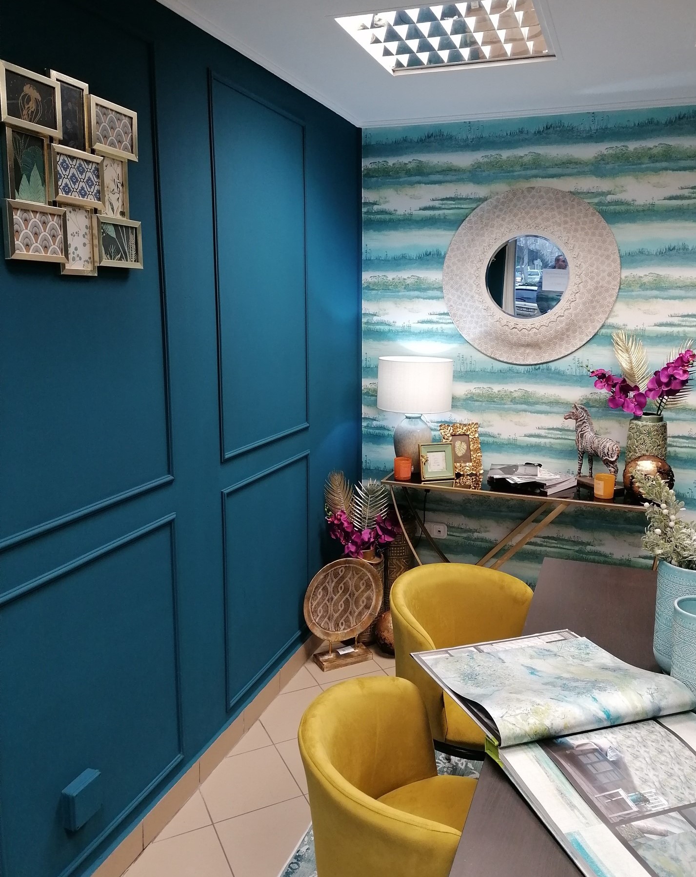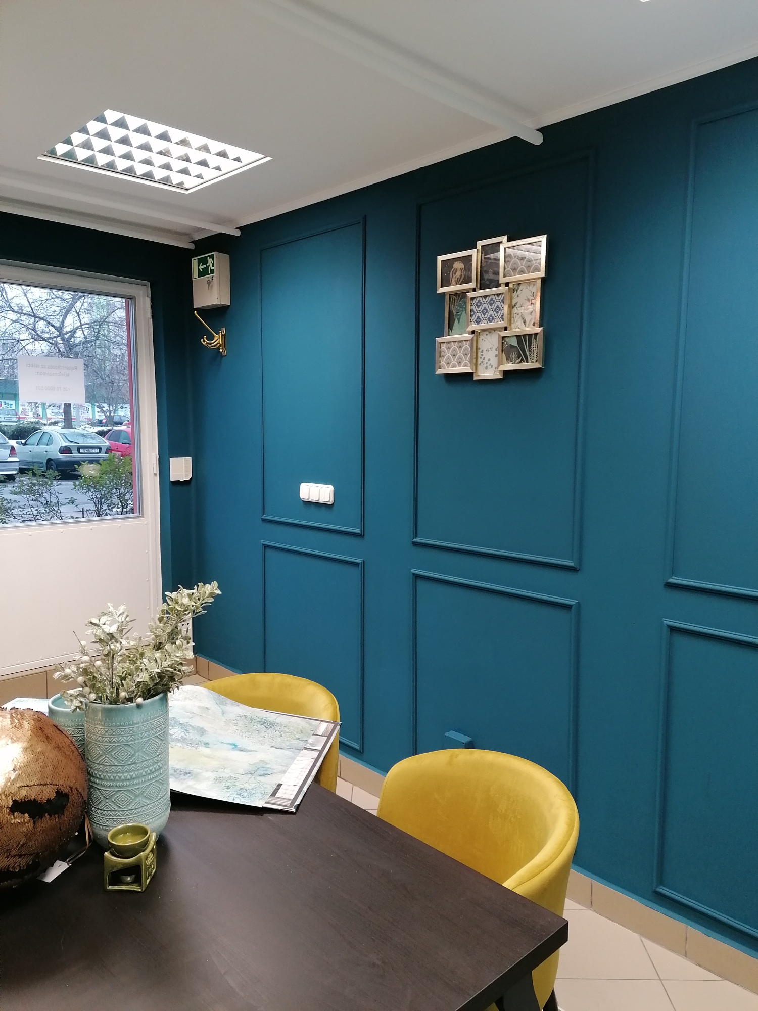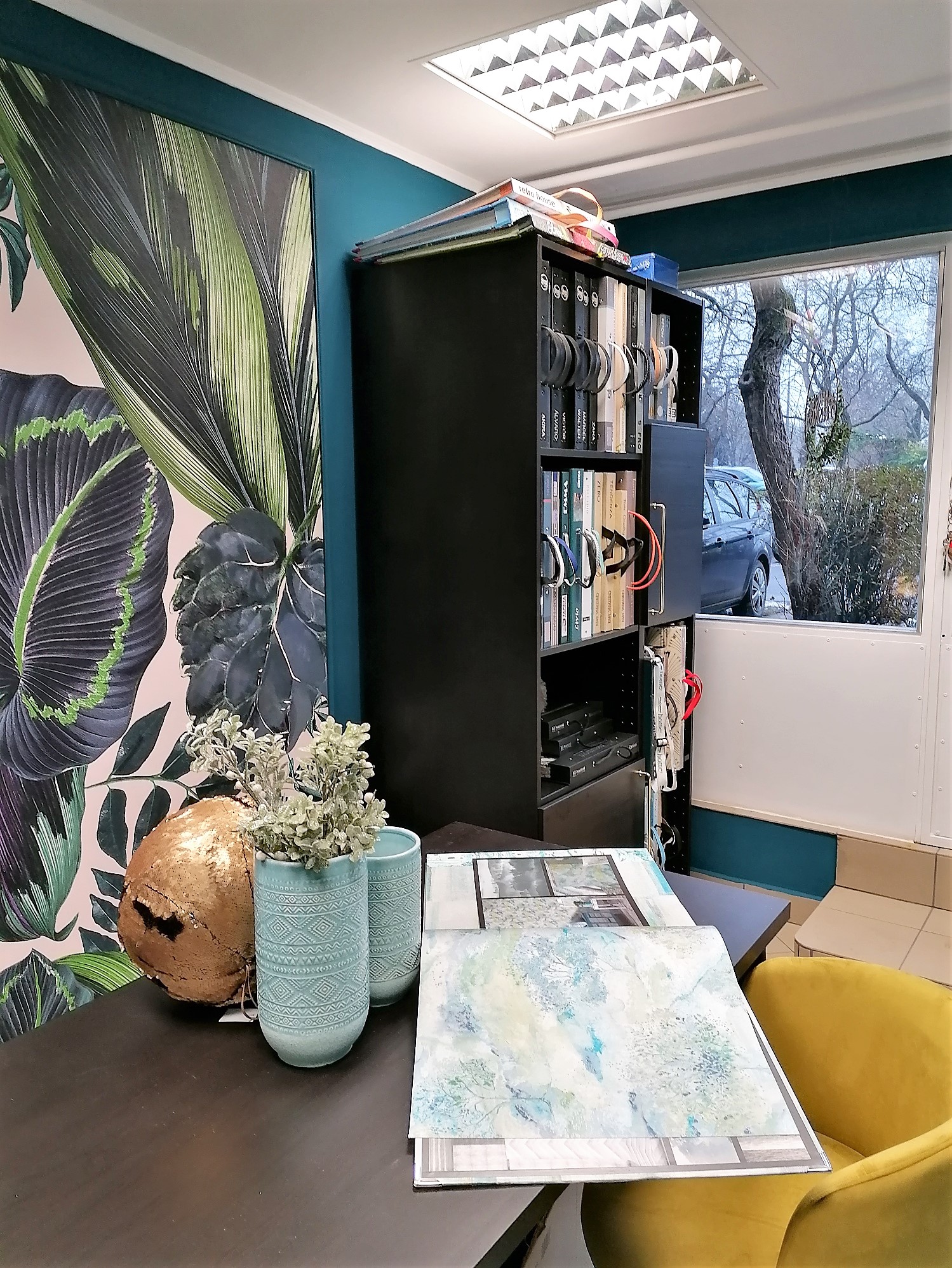 Költséghatékony design, gyors kivitelezés jellemezte a bemutató termünk kialakítását. Igyekeztem egy elegáns környezetet termenteni, ahol otthon érezheti magát mindenki. Fontos szempont volt hogy a berendezés nem haladhatja meg a szabott költséghatárt. Így született meg kompromisszumos megoldásként a mintakönyv tároló, amelyben helyett kapott egy mini hűtő és kávéfőző. A szekrény Ikea konyhabútorból van. Falszínnek egy mély kékes zöld színt választottunk, a kódja NCS színrendszerben: S 6030- B10G .
