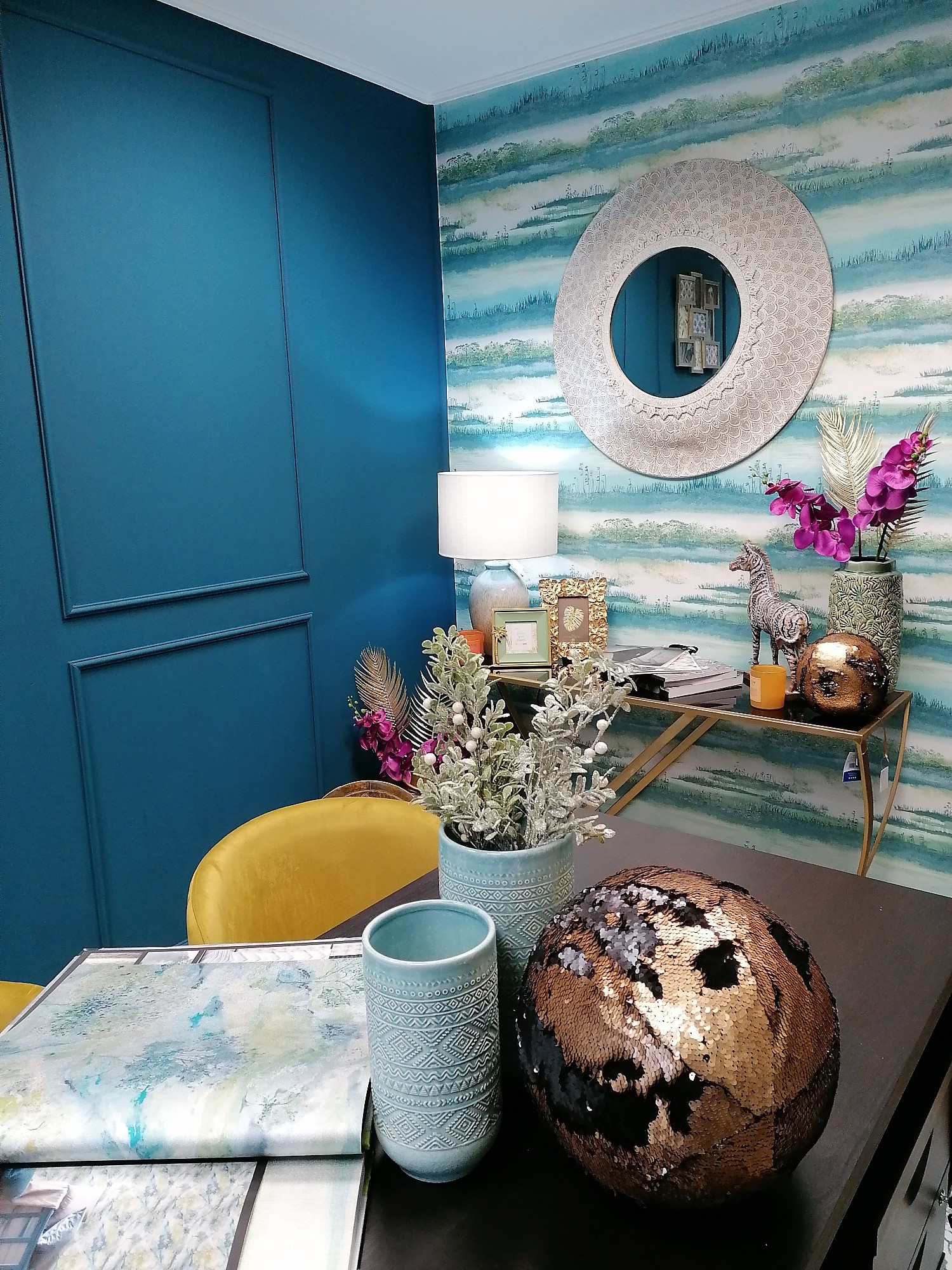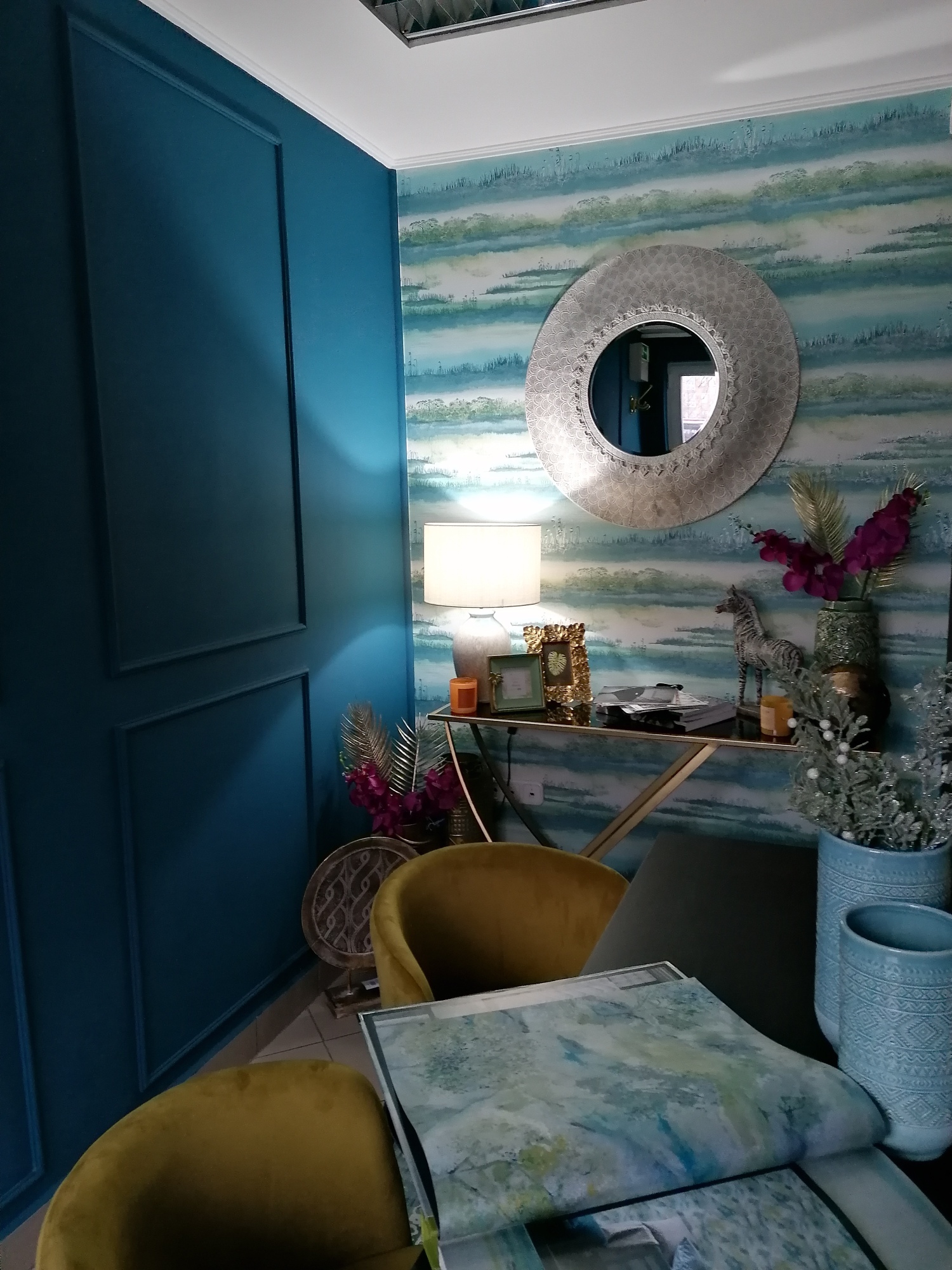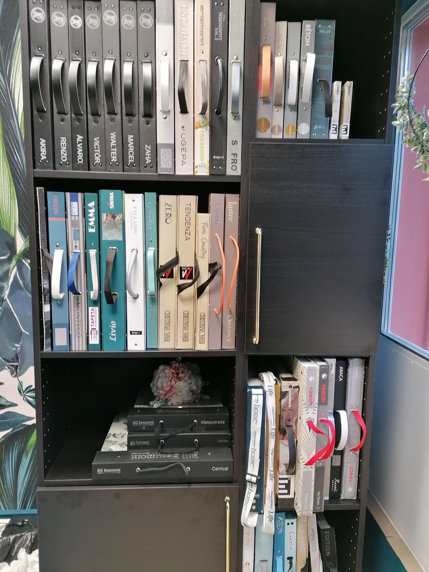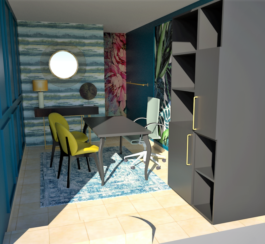 Költséghatékony design, gyors kivitelezés jellemezte a bemutató termünk kialakítását. Igyekeztem egy elegáns környezetet termenteni, ahol otthon érezheti magát mindenki. Fontos szempont volt hogy a berendezés nem haladhatja meg a szabott költséghatárt. Így született meg kompromisszumos megoldásként a mintakönyv tároló, amelyben helyett kapott egy mini hűtő és kávéfőző. A szekrény Ikea konyhabútorból van. Falszínnek egy mély kékes zöld színt választottunk, a kódja NCS színrendszerben: S 6030- B10G .